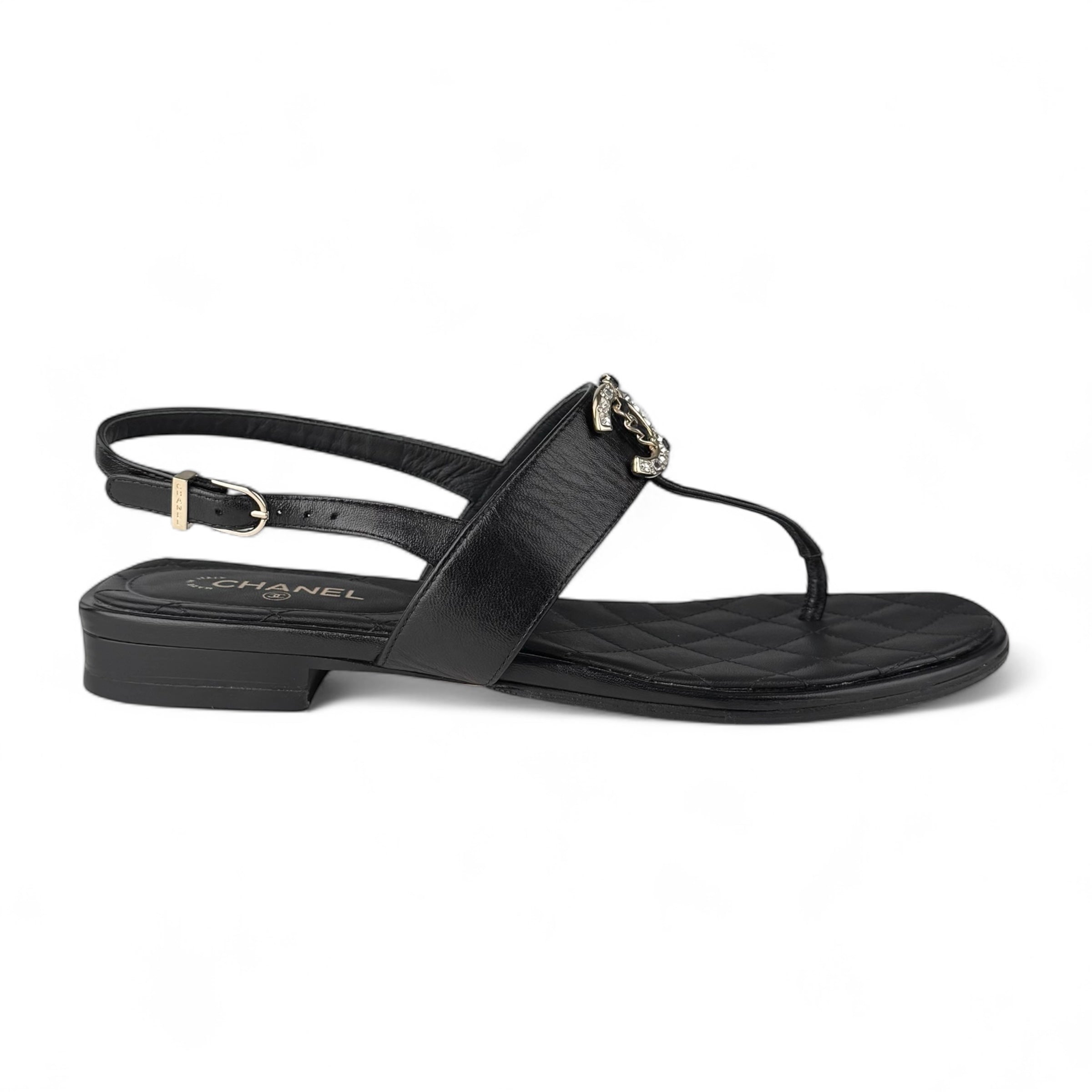 Chanel Black Leather Crystal & Interwoven Chain Interlocking CC Sandals