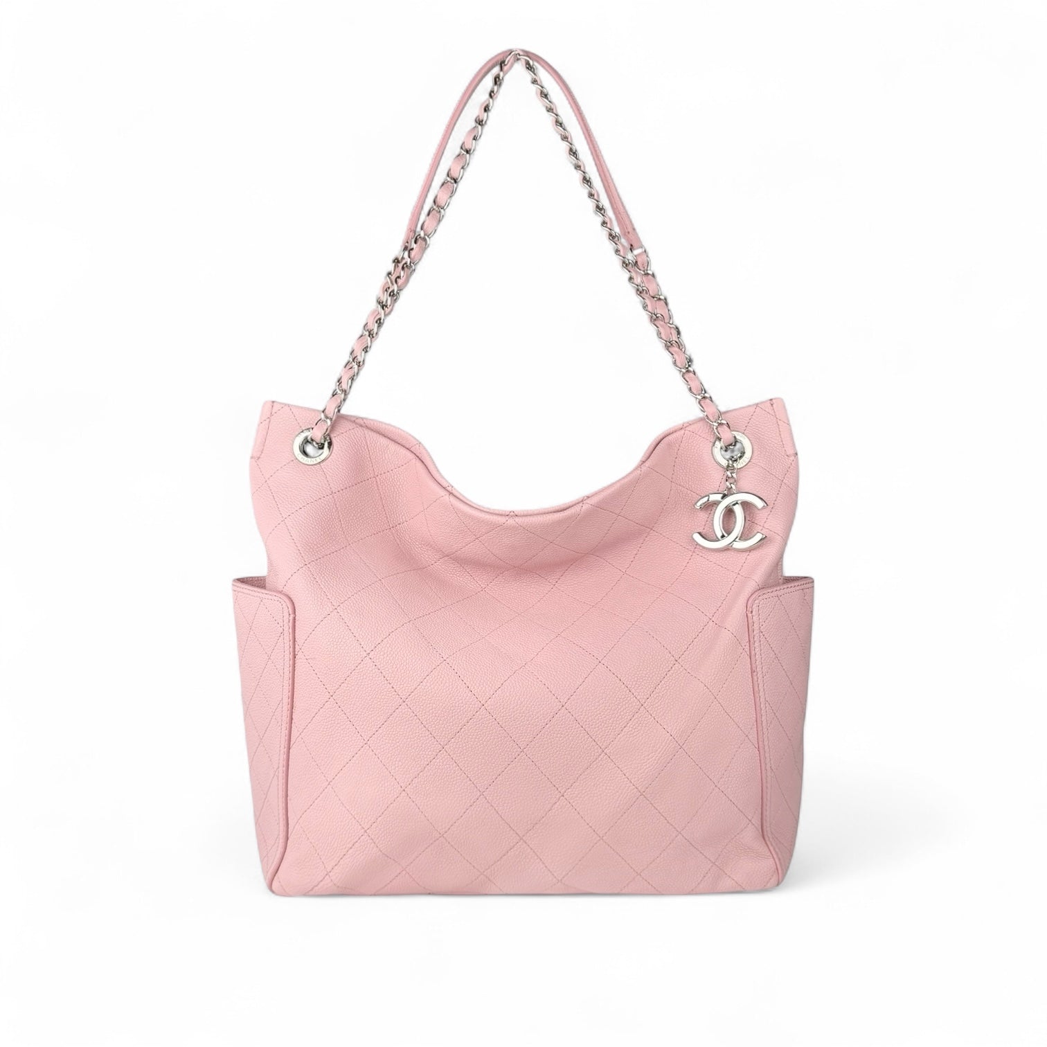 This stylish Chanel CC Pocket hobo tote is crafted of luxurious soft pink diamond stitched caviar leather with bucket pockets at each side. The opening can be styled more upright for a tote look or folded over for a more slouchy hobo look.The bag features a silver Chanel CC medallion and silver chain link leather threaded shoulder straps that can be worn doubled up or pulled through for a longer single strap. The spacious interior features one zipped pocket and two open pockets.