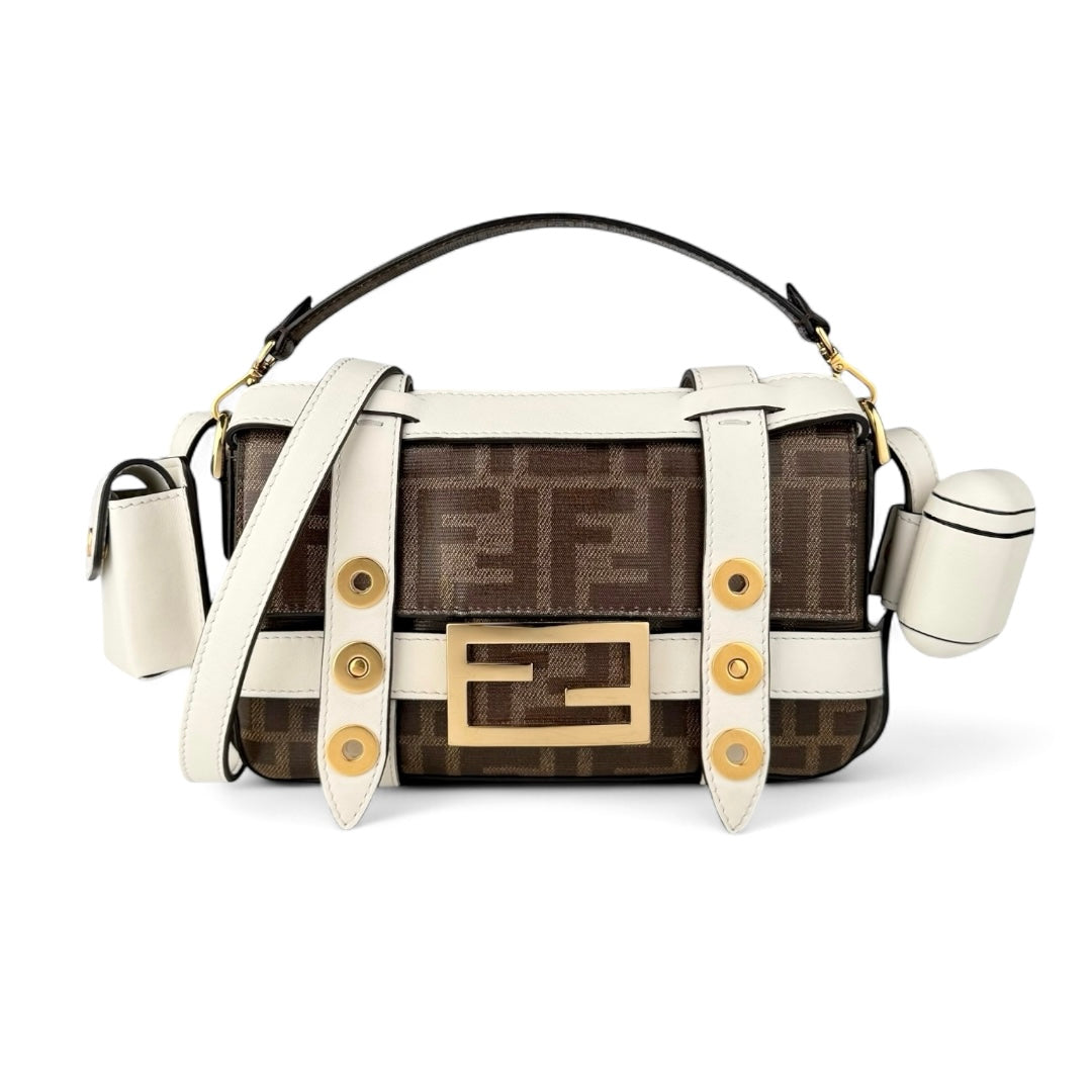 This fresh twist on the iconic Fendi Baguette is a must have for any fashion lover. The mini Baguette is crafted from FF motif patterned glazed fabric with white leather cage and polished gold-tone hardware. There are many ways to wear this bag; as a clutch, with the top handle, with the chain strap or with the leather cage over the shoulder or crossbody. The leather cage also has a small pocket on one side and an airpod pocket on the other which are also removable if desired.