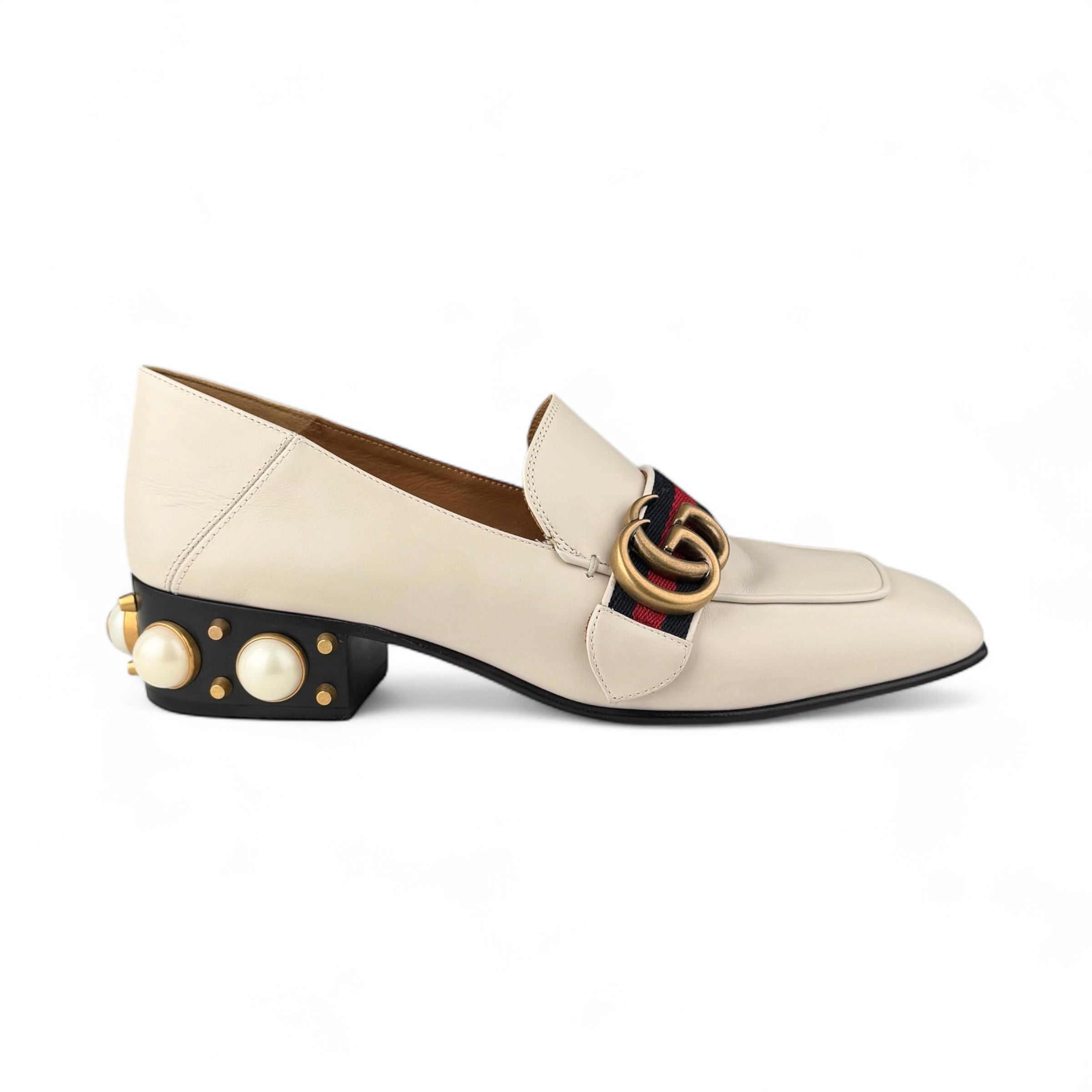 Gucci Ivory Leather Pearl Studded Peyton GG Loafers