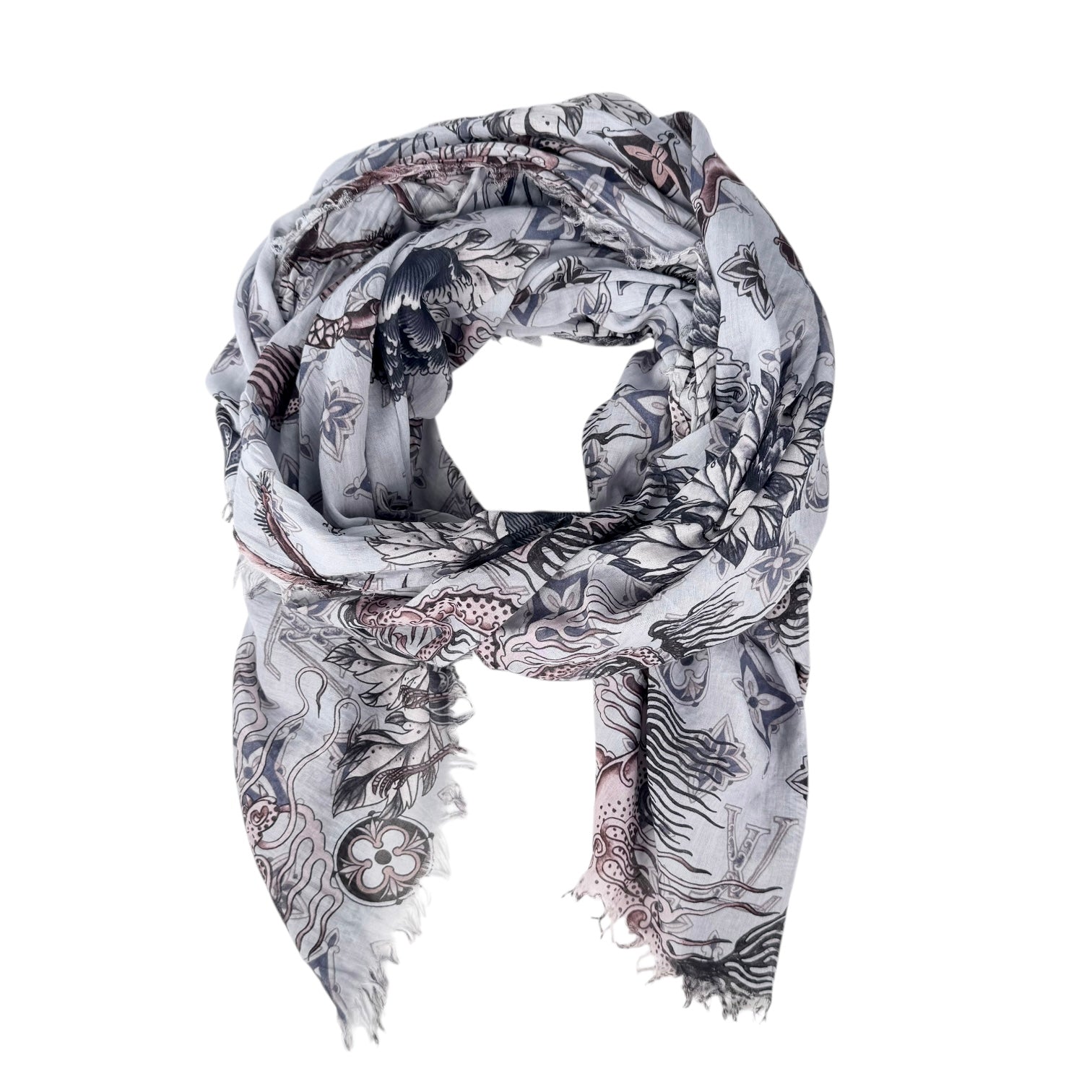 This special edition stole is large and can be worn in many ways but most exceptional is the stylized monogram with stunning tattoo-inspired illustrations of dragons and flowers with lines and colors that flow and blend beautifully. This is truly a collectors piece for the LV connoisseur.
