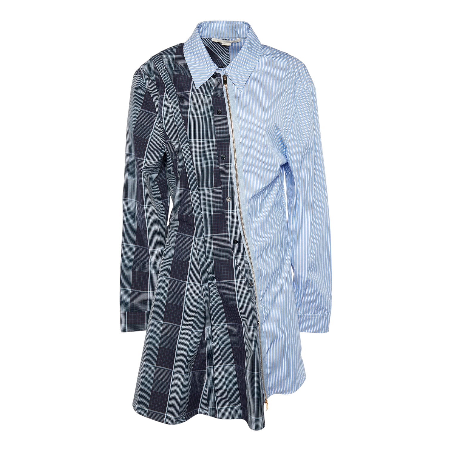 Stella McCartney Pre-Fall 2018 Blue Plaid & Striped Mixed-Print Asymmetric-Zip Shirt Dress