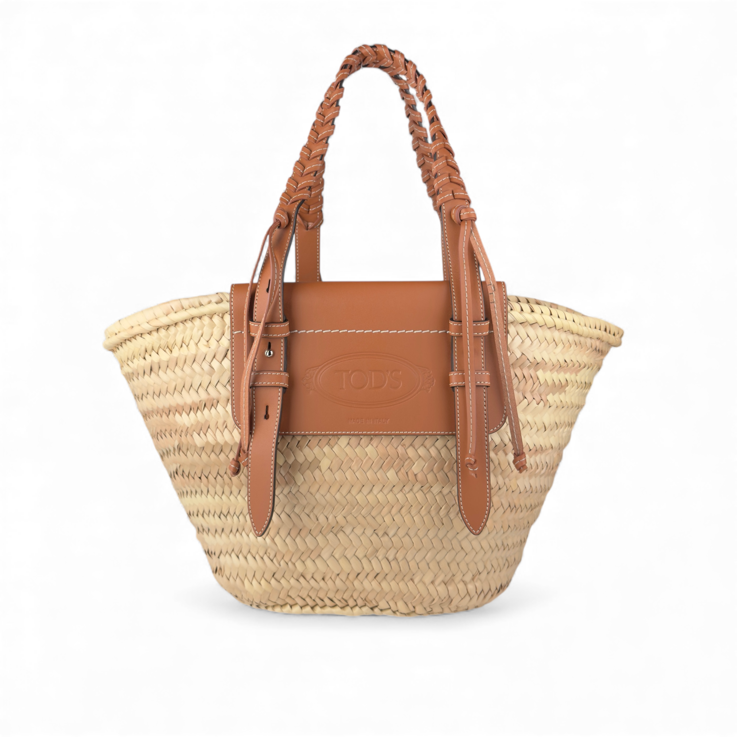 A combination of craftsmanship and easy-chic taste, this large summer tote bag is crafted with handwoven palm leaves and leather inserts finished with exposed stitching. The adjustable handles are decorated with threading, while the front of the shopper is enhanced by the stamped Tod's logo.